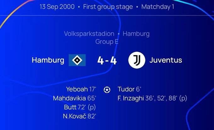 神巧合!尤文上次在欧冠4-4是00年踢汉堡,科瓦奇、图多尔均破门